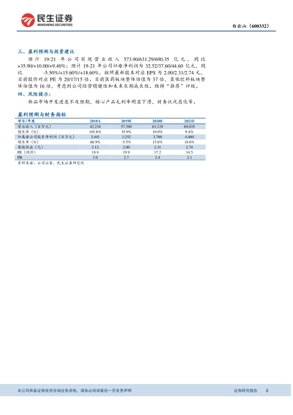 民生证券研究院预计白云山2019-2021年营业收入将分别达到573.90亿元、631.29亿元和690.35亿元,同比增速分别为35.90%、10.00%和9.40%。归属于母公司股东的净利润预计分别为32.52亿元、37.60亿元和44.60亿元,同比增速分别为-5.50%、15.60%和18.60%。对应每股收益分别为2.00元、2.31元和2.74元。 当前股价对应的市盈率(PE)分别为20倍、17倍和15倍。考虑到医药板块整体估值约为37倍,其他饮料板块整体估值约为16倍,白云山在经营稳健性和未来长期成长性方面具备优势。