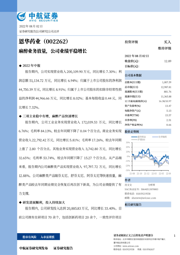 我们预计公司2022-2024年摊薄后(暂不考虑转增的影响)的EPS分别为0.99元、1.23元和1.51元,对应的动态市盈率分别为12.97倍、10.52倍和8.52倍。恩华药业是我国麻醉药品领先企业之一,核心产品在疫情形势稳定后实现快速增长,维持买入评级。