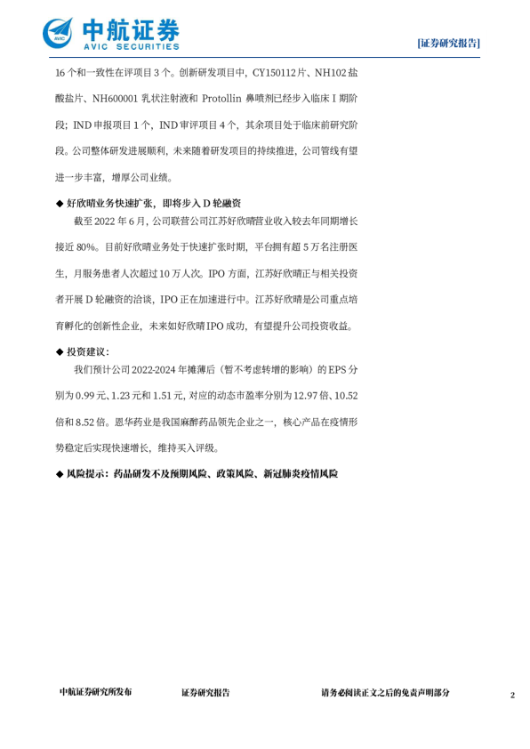 截至2022年6月,公司联营公司江苏好欣晴营业收入较去年同期增长接近80%。目前好欣晴业务处于快速扩张时期,平台拥有超5万名注册医生,月服务患者人次超过10万人次。IP0方面,江苏好欣晴正与相关投资者开展D轮融资的洽谈,IP0正在加速进行中。江苏好欣晴是公司重点培育孵化的创新性企业,未来如好欣晴IP0成功,有望提升公司投资收益。