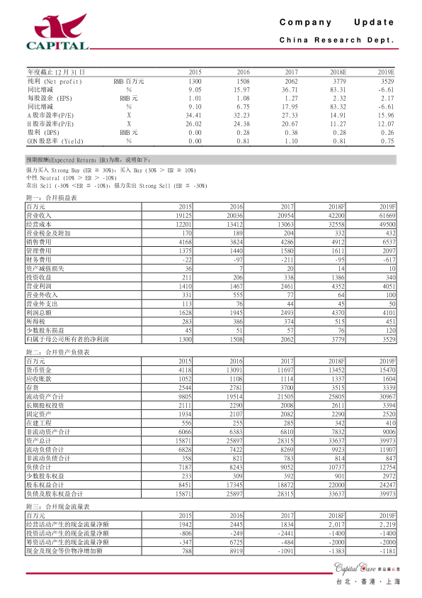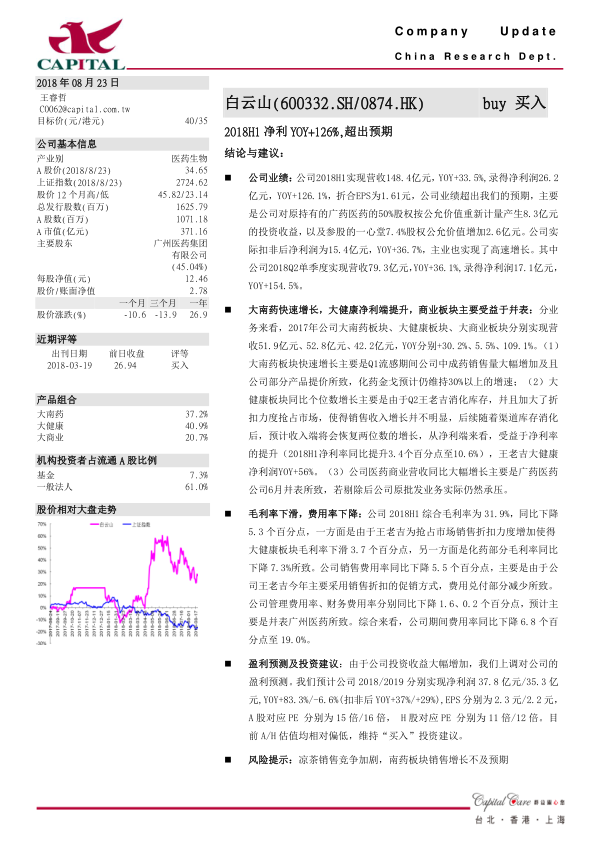 本报告分析了白云山2018年上半年的业绩表现,指出公司业绩超出预期,主要得益于投资收益和主营业务的增长。各业务板块中,大南药板块受益于产品销售和提价,大健康板块净利率提升带动净利润增长,大商业板块受广药医药并表影响显著。报告上调了公司盈利预测,并维持“买入”投资建议,认为公司A/H股估值偏低。同时,报告也提示了凉茶销售竞争加剧和南药板块销售增长不及预期的风险。