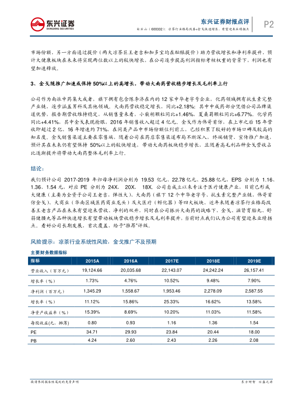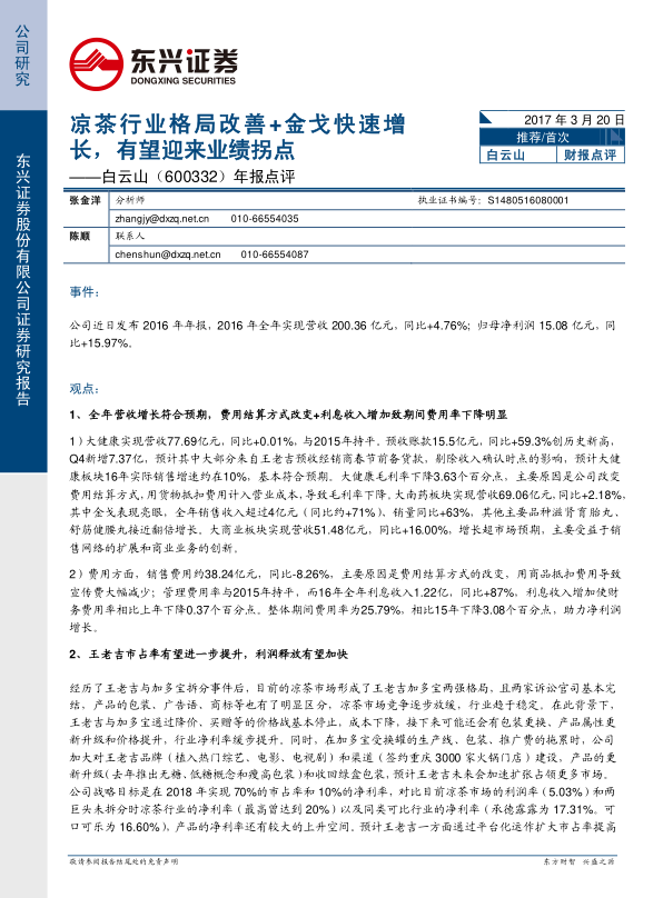 白云山(600332)的年报显示,公司在2016年实现了稳健的营收增长和显著的净利润提升。凉茶行业格局的改善为王老吉的市场扩张提供了机遇,而金戈的快速增长则成为大南药板块的重要驱动力。公司通过费用控制和多元化业务发展,有望在未来实现业绩的持续增长,建议首次覆盖,给予“推荐”评级。