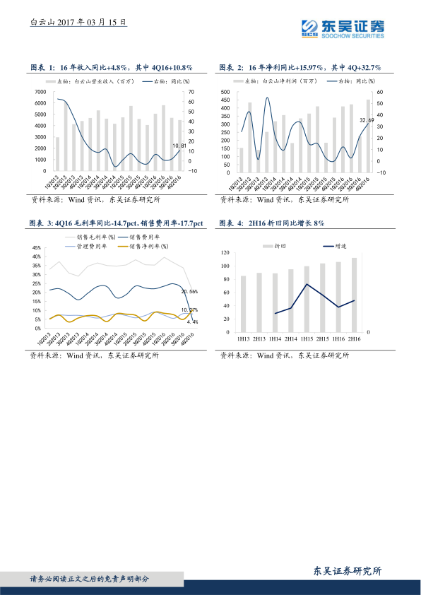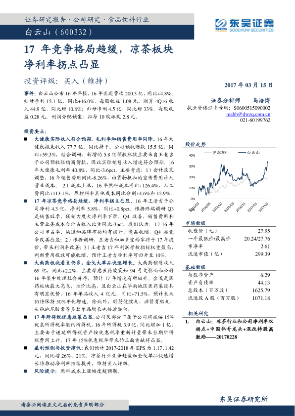 本报告对白云山2016年年报进行了深入分析,认为公司在凉茶业务竞争格局改善、金戈等单品快速增长以及税收优惠政策的推动下,盈利能力有望持续提升。维持买入评级,但需关注原料成本上涨超预期的风险。