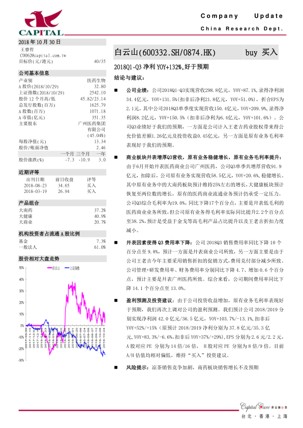 本报告分析了白云山(600332.SH/0874.HK)2018年Q1-Q3的业绩表现,指出公司净利润大幅增长超出预期,主要受益于王老吉药业股权公允价值变动和原有业务毛利率的提升。报告详细分析了商业板块并表对营收和费用率的影响,并指出公司原有业务保持稳健增长,毛利率有所提升。基于公司良好的业绩表现和未来发展潜力,报告上调了盈利预测,并维持“买入”投资建议,但同时也提示了凉茶市场竞争加剧和南药板块销售增长不及预期的风险。