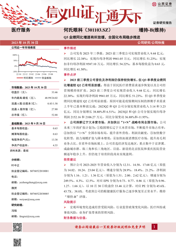 本报告分析了何氏眼科(301103.SZ)2023年三季报,指出公司前三季度营收和净利润保持较快增长,但Q3单季度业绩增速放缓。同时,报告强调了公司深耕辽宁市场并积极推进全国化“1+N”战略布局。