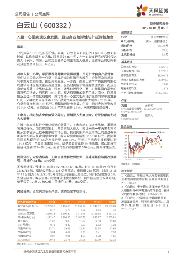 白云山通过战略入股一心堂,成功构建了医药工业、商业、零售业的协同发展模式,有效拓宽了医药产品销售渠道,并有望分享医药零售业的增长红利。同时,核心品牌王老吉在市场竞争中表现强劲,通过加大营销投入和产品创新,预计未来三年将实现收入和利润的显著增长,为公司贡献巨大的业绩弹性。当前公司估值处于历史低位,具备高安全边际,且在广州市政府的大力支持下,外延整合和国企改革预期强烈,有望进一步释放公司价值。综合来看,白云山具备多重增长驱动因素,投资价值显著,维持“买入”评级,目标价33元,预计有38%的上涨空间。