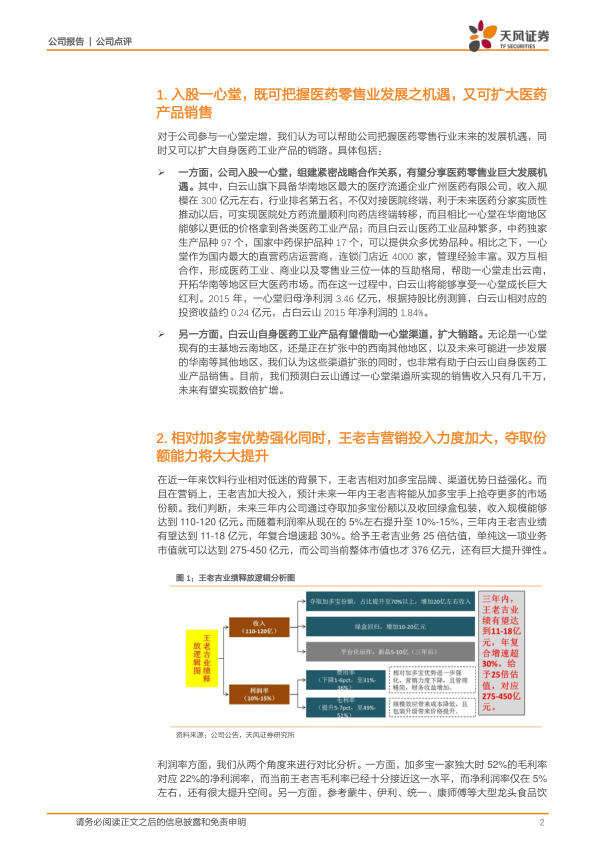 本报告核心观点指出,白云山通过战略入股一心堂,成功把握医药零售业发展机遇,并有效拓宽自身医药工业产品的销售渠道,实现医药工业、商业与零售业的三位一体互助格局。同时,旗下核心品牌王老吉在市场竞争中优势日益强化,通过加大营销投入和市场份额抢夺,预计未来将实现显著的业绩增长和利润率提升。