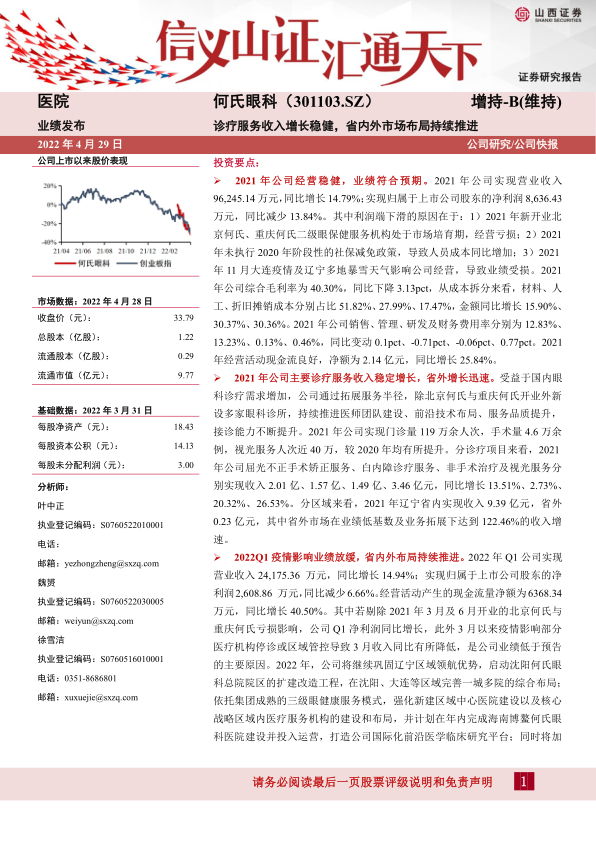 本报告对何氏眼科(301103.SZ)进行了业绩分析和未来展望。公司2021年经营稳健,主要诊疗服务收入稳定增长,省外市场增长迅速。2022年Q1业绩受疫情影响,但公司长期战略布局持续推进。预计未来几年营业收入和净利润将保持快速增长,维持“增持-B”评级。同时,报告也提示了疫情、政策、医疗纠纷以及业务扩张等风险。