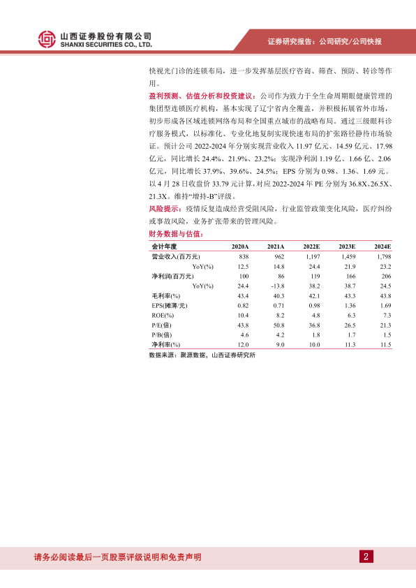 盈利预测、估值分析和投资建议:公司作为致力于全生命周期眼健康管理的集团型连锁医疗机构,基本实现了辽宁省内全覆盖,并积极拓展省外市场,初步形成各区域连锁网络布局和全国重点城市的战略布局。通过三级眼科诊疗服务模式,以标准化、专业化地复制实现快速布局的扩张路径静待市场验证。预计公司 2022-2024 年分别实现营业收入 11.97 亿元、14.59 亿元、17.98亿元,同比增长 24.4%、21.9%、23.2%;实现净利润 1.19 亿、1.66 亿、2.06亿元,同比增长 37.9%、39.6%、24.5%;EPS 分别为 0.98、1.36、1.69 元。以 4 月 28 日收盘价 33.79 元计算, 对应 2022-2024 年 PE 分别为 36.8X、 26.5X、21.3X。维持“增持-B”评级。