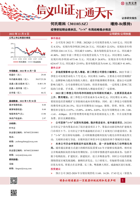何氏眼科发布的三季报显示,尽管短期业绩受到疫情影响,但公司“1+N”全国布局战略仍在稳步推进。
