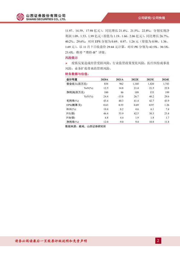 预计公司2022-2024年分别实现营收11.68、14.20、17.43亿元(原值为11.97、14.59、17.98亿元),同比增长21.4%、21.5%、22.8%;分别实现净利润1.09、1.53、1.99亿元(原值为1.19、1.66、2.06亿元),同比增长26.7%、40.2%、29.6%;对应EPS分别为0.69、0.97、1.26元(原值为0.98、1.36、1.69元),以11月7日收盘价29.44元计算,对应PE分别为42.5X、30.3X、23.4X,维持“增持-B”评级。