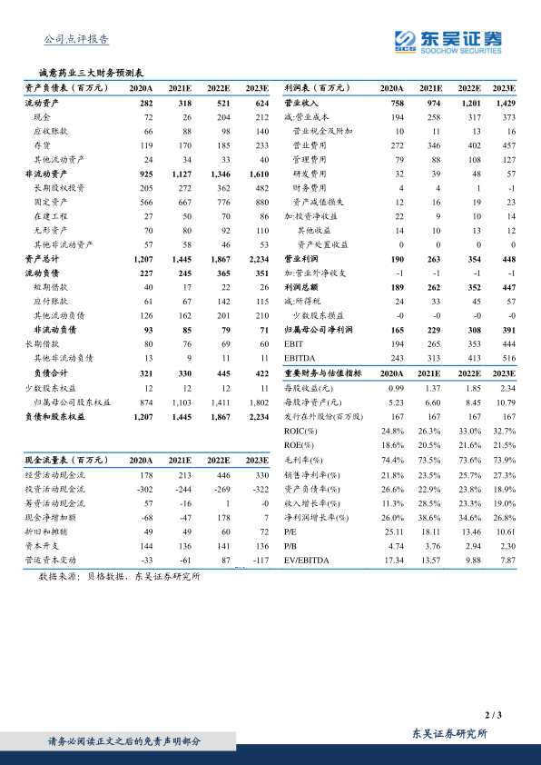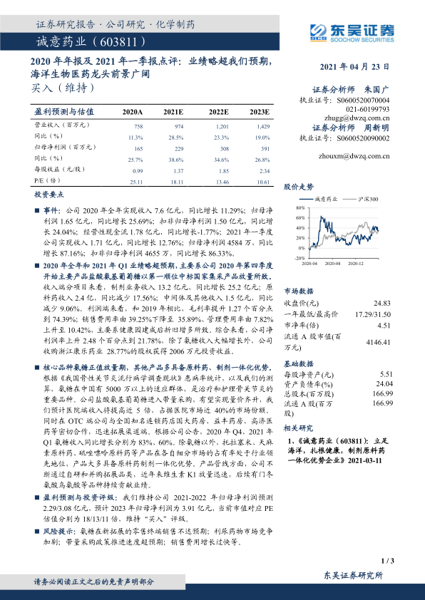 本报告分析了诚意药业2020年年报及2021年一季报,指出公司业绩略超预期,主要受益于核心产品氨糖的放量。公司在原料药和制剂一体化方面具备优势,并通过不断拓展产品管线来增强竞争力。报告维持了对公司未来盈利的预测,并维持“买入”评级,但同时也提示了氨糖销售不达预期、市场竞争加剧以及政策变动等风险。