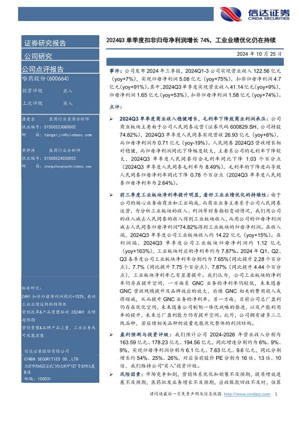 哈药股份2024年三季报显示,公司扣非归母净利润显著增长,其中工业板块业绩优化是主要驱动力。商业板块收入保持稳健,但利润受到毛利率下降的影响。信达证券维持对公司“买入”的投资评级,并预计未来几年公司业绩将保持稳健增长。