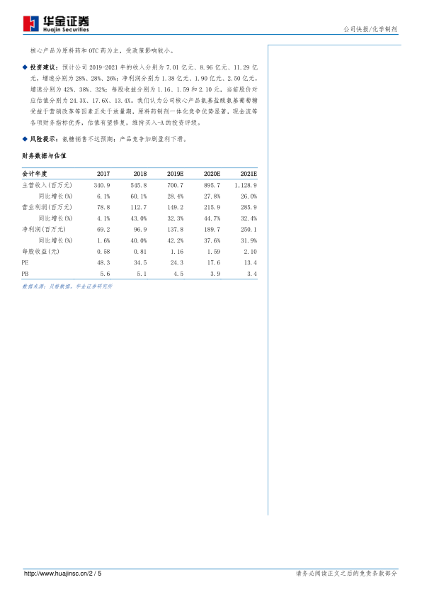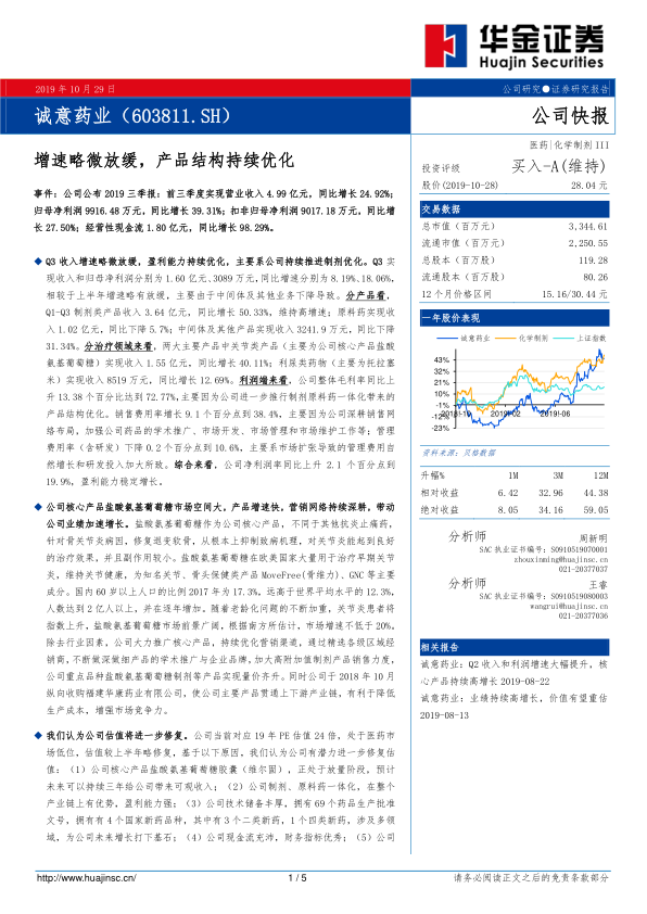 本报告分析了诚意药业2019年三季报,指出公司业绩增长主要受益于核心产品盐酸氨基葡萄糖的放量和制剂产品的优化。公司在老龄化趋势下具备广阔的市场前景,且产业链一体化和技术储备为其长期发展奠定了基础。维持“买入-A”评级,认为公司估值有修复潜力,但需关注氨糖销售和市场竞争风险。