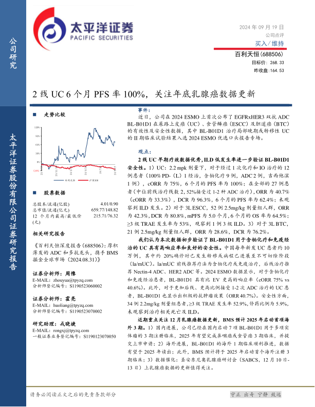 本报告主要围绕百利天恒的BL-B01D1药物临床数据展开分析,并结合市场情况给出投资建议。