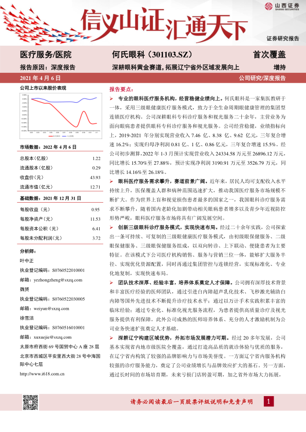 公司作为致力于全生命周期眼健康管理的集团型连锁医疗机构, 在 A 股市场具有相对稀缺性。公司未来发展看点在于:1)面对老龄化加剧相关眼科疾病进入发病期以及青少年近视防治形势严峻,患者需求增加并呈现多样化,眼科医疗服务市场面临广阔空间。2)公司已实现辽宁省内全覆盖,三级眼保健服务有望维持医疗技术、经验与品牌优势,影响力继续扩大,奠定公司业绩基本盘;部分新设服务机构逐步由培育期转入成熟期后,接诊量与客单价有望进一步提升并逐步实现盈利;3)未来公司将积极拓展省外市场,以一线城市为中心实现区域突破,凭借三级服务模式进行快速布局,在本地市场积累口碑与品牌,提高省外业务的扩张。我们预计公司 2022-2024 年分别实现营业收入 11.97 亿元、 14.59 亿元、 17.98 亿元,同比增长 24.4%、 21.9%、23.2%;实现净利润 1.19 亿、1.66 亿、2.07 亿元,同比增长 37.9%、39.6%、24.7%;对应 EPS 分别为 0.98、1.37、1.71 元。以 4 月 6 日收盘价 43.93 元计算,何氏眼科对应 2022-2024 年 PE 分别为 44.8X、32.1X、25.7X。首次覆盖给予“增持”评级。