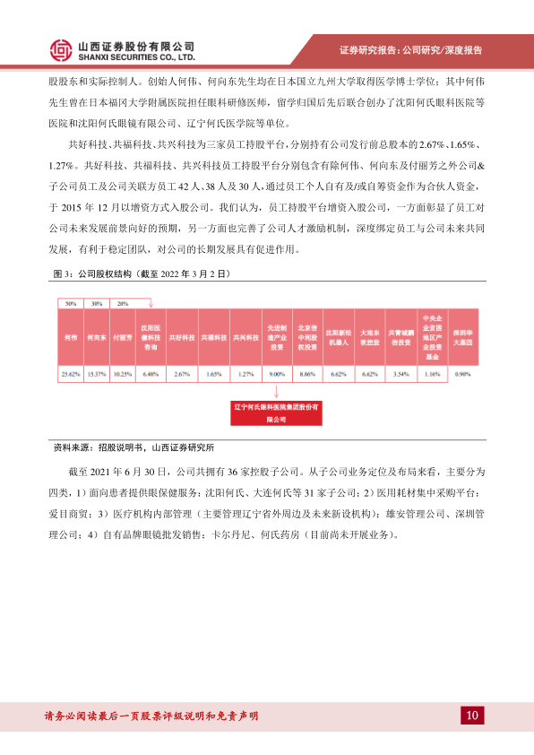 何氏眼科由留学归国眼科医学博士何伟及其团队创办,是一家集医教研于一体的集团型连锁医疗机构,采用三级眼健康医疗服务模式,致力于全生命周期眼健康管理。公司深耕眼科专科诊疗服务和视光服务二十余年,主营业务包括白内障、青光眼、玻璃体视网膜病变等常见致盲性眼病以及屈光不正矫正、干眼、中医等特色诊疗服务。公司发展历程可分为建院初始期(1995-2008)、模式完善期(2009-2014)、快速发展期(2015-2018)和战略布局期(2019至今),逐步完善了医疗服务网络并积极拓展全国业务。截至2022年3月2日,何伟、何向东、付丽芳共同控制公司63.31%股份,员工持股平台也通过增资入股,完善了人才激励机制。