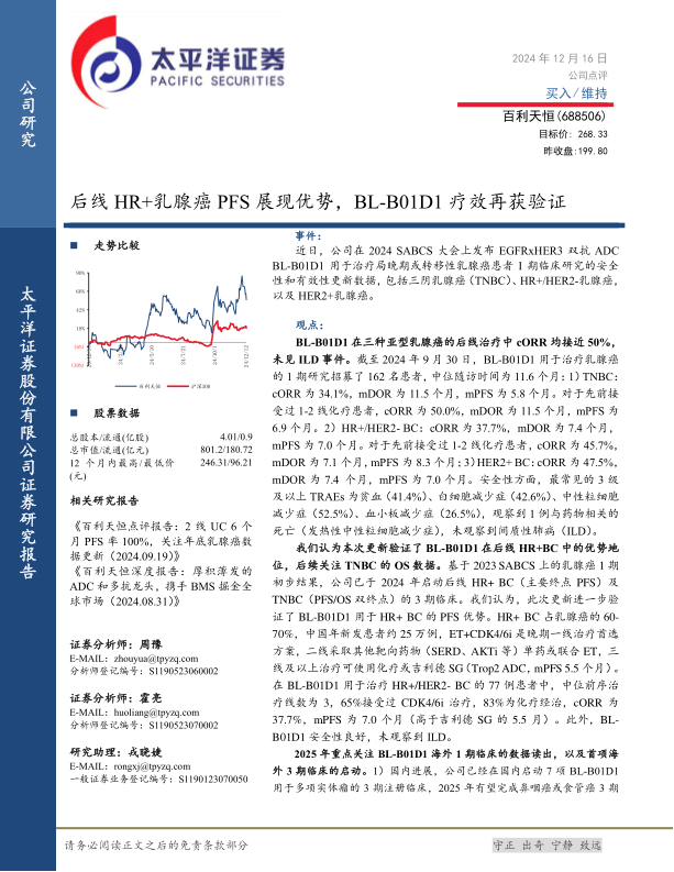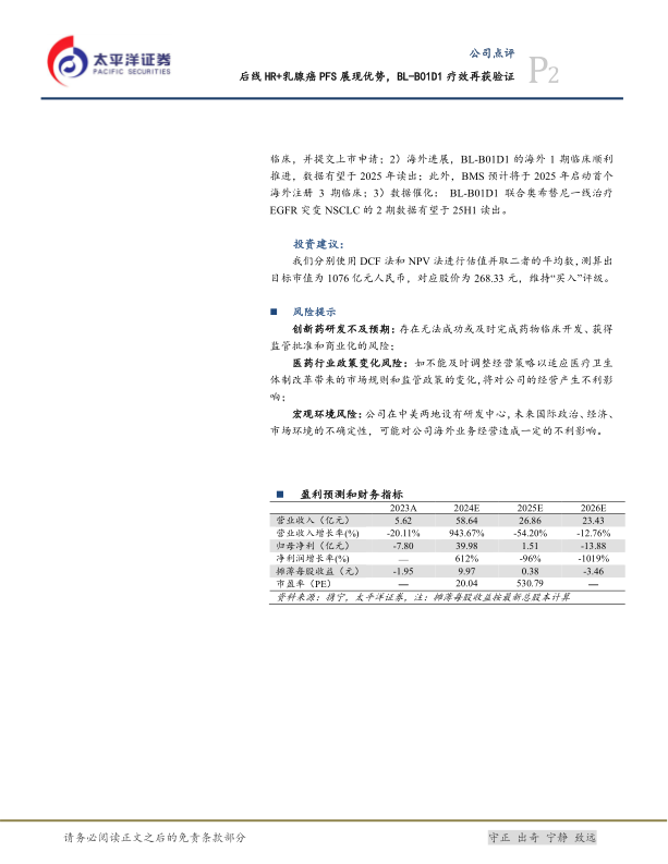 投资建议:估值与评级 太平洋证券采用DCF(现金流折现法)和NPV(净现值法)进行估值,并取二者的平均数,测算出百利天恒的目标市值为1076亿元人民币,对应目标股价为268.33元。基于BL-B01D1的优异临床数据和广阔市场前景,维持对百利天恒的“买入”评级。