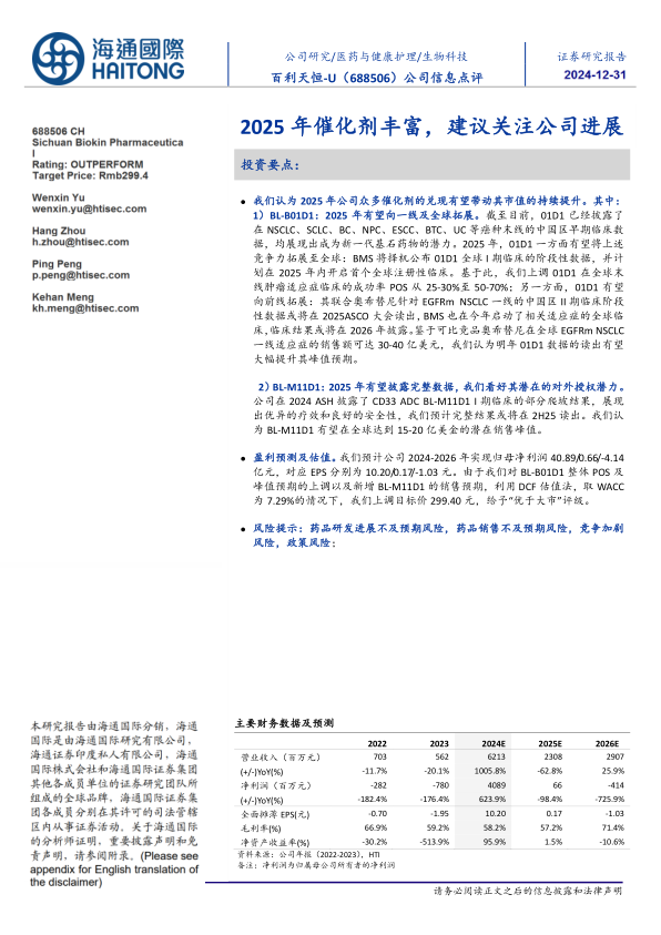 盈利预测及估值。我们预计公司2024-2026年实现归母净利润40.89/0.66/-4.14亿元,对应EPS分别为10.20/0.17/-1.03元。由于我们对BL-B01D1整体POS及峰值预期的上调以及新增BL-M11D1的销售预期,利用DCF估值法,取WACC为7.29%的情况下,我们上调目标价299.40元,给予“优于大市”评级。