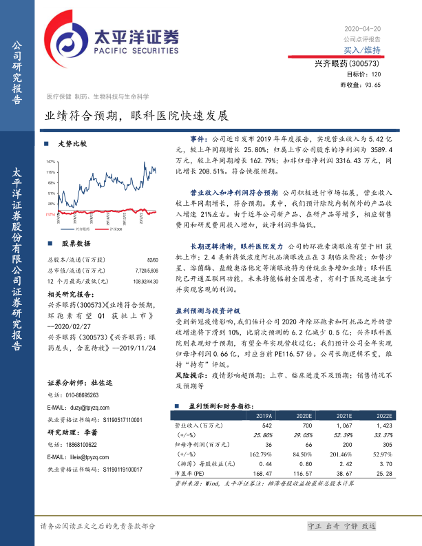 兴齐眼药在2019年实现了显著的业绩增长,营业收入和归母净利润分别同比增长25.80%和162.79%,符合市场预期。公司积极的市场拓展策略,特别是眼科医院业务的快速发展和互联网功能的开通,预示着其在全国患者覆盖和盈利能力提升方面的巨大潜力。