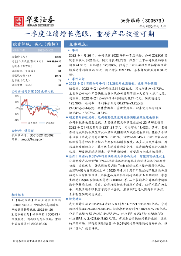 本报告对兴齐眼药2022年一季度业绩进行了全面分析,认为公司业绩增长主要受益于核心产品放量和前期学术推广的积累。公司在研新药,特别是低浓度阿托品滴眼液,研发进展顺利,具有巨大的市场潜力。同时,公司产品在干眼症治疗领域竞争格局良好,有望实现快速放量。维持“买入”投资评级,并预测公司未来几年收入和净利润将保持高速增长。但同时也提示了药品推广不及预期、新药研发和审批以及医药政策波动等风险。