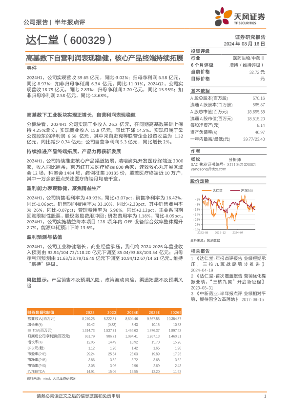 达仁堂2024年上半年业绩在高基数下略有下滑,但工业板块表现稳健,自营利润实现增长。公司积极拓展终端渠道,并在精益生产方面取得进展。报告下调了公司未来几年的盈利预测,但维持“增持”评级,同时提示了产品销售、政策波动和渠道拓展等风险。
