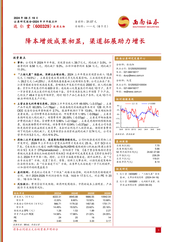 本报告对达仁堂(600329)2024年半年报进行了深度分析,核心观点如下: