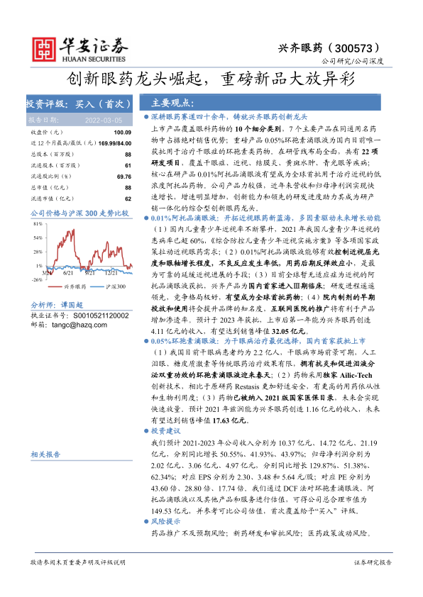 我们预计 2021-2023 年公司收入分别为 10.37 亿元、 14.72 亿元、 21.19亿元,分别同比增长 50.55%、 41.93%、 43.97%;归母净利润分别为2.02 亿元、 3.06 亿元、 4.97 亿元,分别同比增长 129.87%、 51.38%、62.34%;对应 EPS 分别为 2.30、 3.48 和 5.64 元/股;对应 PE 分别为43.60 倍、 28.80 倍、 17.74 倍。我们通过 DCF 法对环孢素滴眼液、阿托品滴眼液以及其他产品和服务进行估值,可得公司总合理市值为149.53 亿元,并参考可比公司估值,首次覆盖给予“买入”评级。