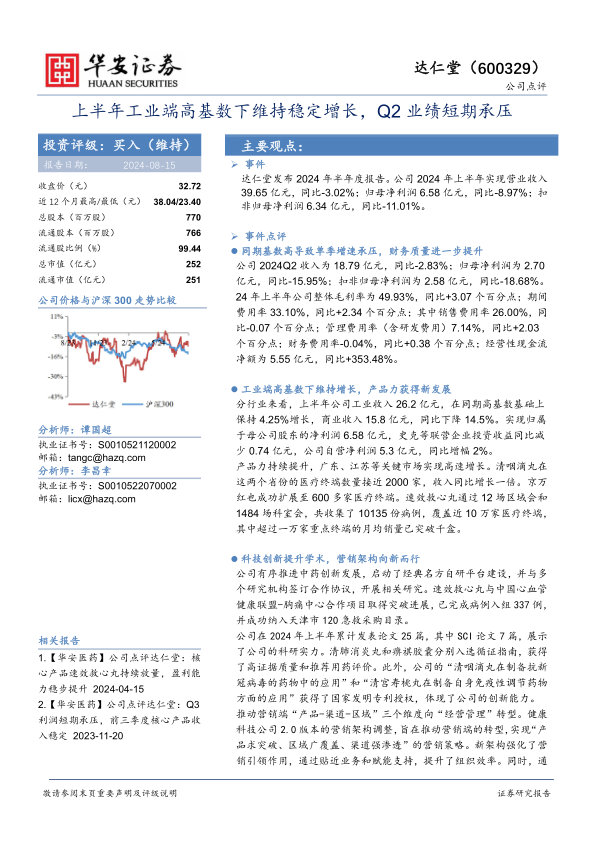 本报告对太极集团2024年上半年的业绩进行了分析,指出: