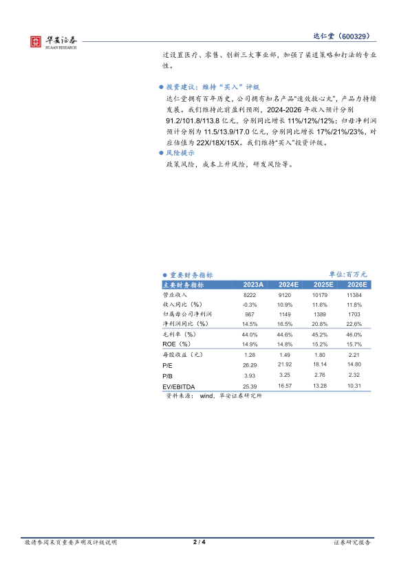 达仁堂拥有百年历史,公司拥有知名产品“速效救心丸”,产品力持续发展。我们维持此前盈利预测,2024-2026年收入预计分别91.2/101.8/113.8亿元,分别同比增长11%/12%/12%;归母净利润预计分别为11.5/13.9/17.0亿元,分别同比增长17%/21%/23%,对应估值为22X/18X/15X。我们维持“买入”投资评级。