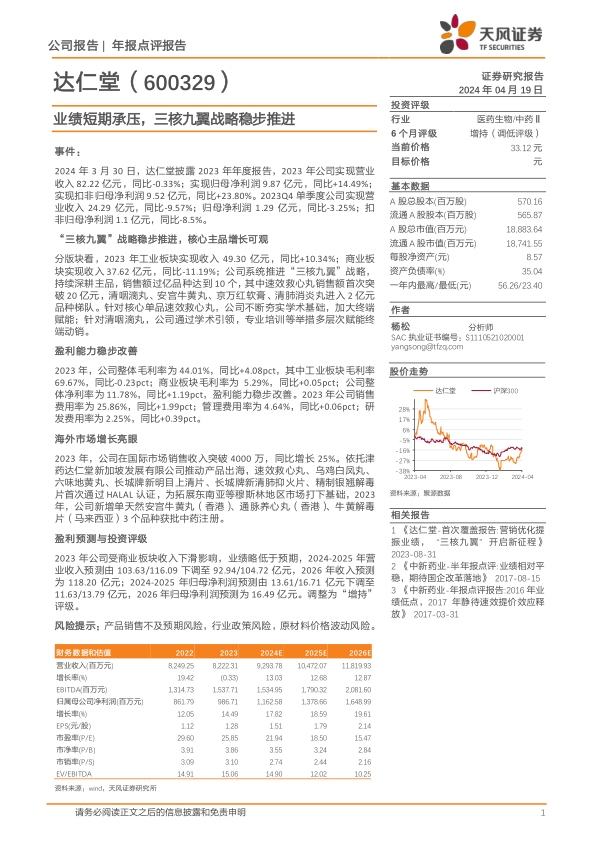 达仁堂2023年年报显示,尽管受商业板块拖累营收短期承压,但公司通过“三核九翼”战略有效推动工业板块核心产品实现可观增长,盈利能力显著改善。国际市场拓展取得积极成效,为未来发展注入新动力。尽管盈利预测有所调整,但公司在医药生物/中药Ⅱ行业的长期增长潜力依然受到肯定,投资评级维持“增持”。
