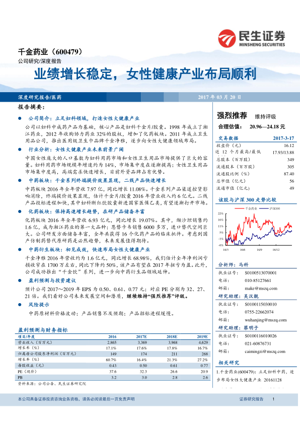 报告深入分析了千金药业在中药、化药及中药衍生品三大核心业务板块的市场表现与增长驱动力。中药板块通过核心产品提价和二线产品医保准入加速,盈利空间显著提升;化药板块凭借仿制药的高性价比优势,在乙肝和心血管用药市场快速抢占份额,并拥有丰富的在研产品储备;中药衍生板块则以医用级卫生巾“千金净雅”为代表,成功切入女性消费品市场,并有望在2017年实现扭亏为盈。这些多元化的业务布局共同驱动公司收入和利润的稳定增长,为投资者提供了明确的投资价值。