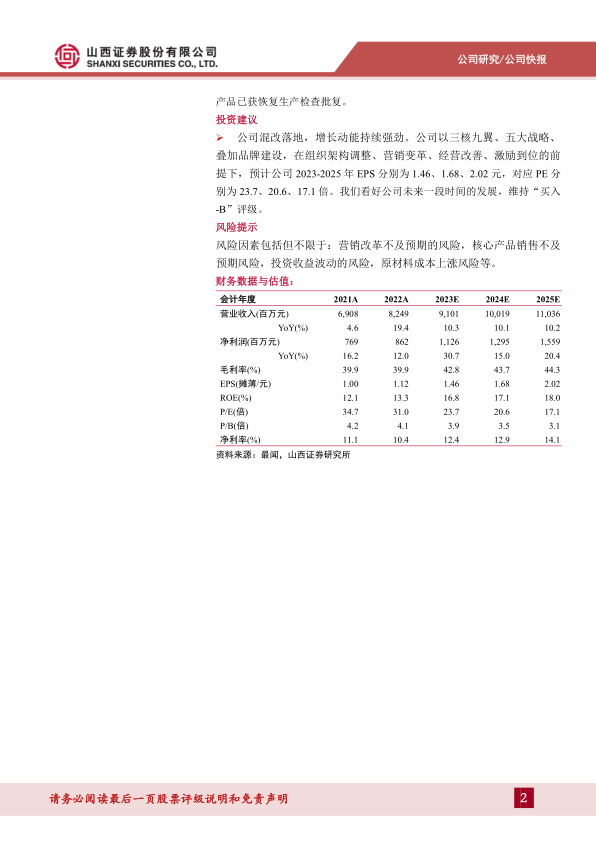 公司混改落地, 增长动能持续强劲。 公司以三核九翼、 五大战略、叠加品牌建设, 在组织架构调整、 营销变革、 经营改善、 激励到位的前提下, 预计公司 2023-2025 年 EPS 分别为 1.46、 1.68、 2.02 元, 对应 PE 分别为 23.7、 20.6、 17.1 倍。 我们看好公司未来一段时间的发展, 维持“买入-B” 评级。