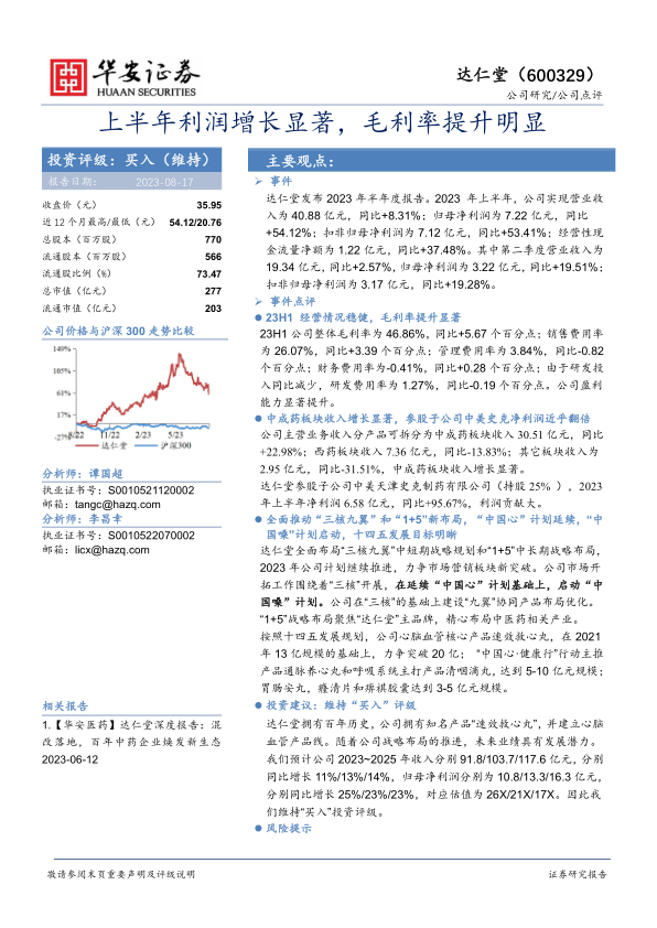 本报告对达仁堂2023年上半年的业绩进行了分析,并维持“买入”评级。