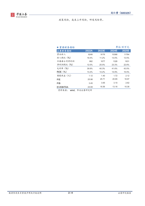 达仁堂拥有百年历史,公司拥有知名产品“速效救心丸”,并建立心脑血管产品线。随着公司战略布局的推进,未来业绩具有发展潜力。我们预计公司2023~2025年收入分别91.8/103.7/117.6亿元,分别同比增长11%/13%/14%,归母净利润分别为10.8/13.3/16.3亿元,分别同比增长25%/23%/23%,对应估值为26X/21X/17X。因此我们维持“买入”投资评级。