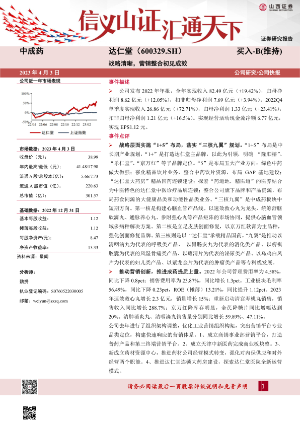 公司控股股东混改落地, 公司中药品牌、 品种、 老字号资源丰富, 已经制定了十四五规划, 以三核九翼、 五大战略、 叠加品牌建设, 在营销变革、 经营改善、 激励到位的前提下, 我们认为公司的收入和利润增速继续增长。 预计公司 2023~2025 年归母净利润分别为 10.25 亿元、 12.34 亿元、 14.96 亿元, EPS 分别为 1.32、 1.60、 1.93 元, PE 分别为 29.4、 24.4、20.2 倍, 维持“买入-B”评级。
