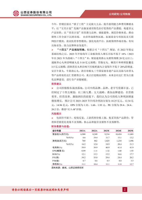 公司控股股东混改落地,公司中药品牌、品种、老字号资源丰富,已经制定了十四五规划,以三核九翼、五大战略、叠加品牌建设,在营销变革、经营改善、激励到位的前提下,我们认为公司的收入和利润增速继续增长。预计公司2023~2025年归母净利润分别为10.25亿元、12.34亿元、14.96亿元,EPS分别为1.32、1.60、1.93元,PE分别为29.4、24.4、20.2倍,维持“买入-B”评级。