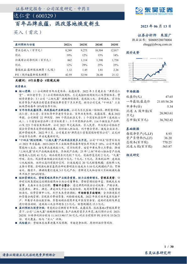达仁堂凭借其深厚的百年品牌底蕴和成功的混合所有制改革,正迎来全新的发展阶段。通过优化组织管理、革新营销策略以及重塑产业链条,公司有效激发了企业活力,提升了运营效率。在“三核九翼”战略的指引下,以速效救心丸为代表的心脑血管产品线、京万红软膏为代表的创面修复产品以及精品国药系列均展现出强劲的市场增长势头和广阔的发展空间。报告预测,公司2023-2025年归母净利润将分别达到11.14亿元、13.90亿元和17.38亿元,对应当前股价PE分别为33倍、26倍和21倍。鉴于公司作为百年老字号在混改落地后的长期发展潜力,首次覆盖给予“买入”评级。同时,需关注营销改革进展不及预期、市场竞争加剧以及原材料涨价等潜在风险。
