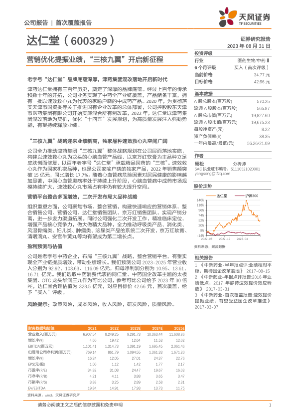 公司是老字号中药企业,布局“三核九翼”战略,整合营销平台,有望实现全产业链提质增效,带动业绩增长。我们预测公司2023-2025年营业收入分别为92.92、103.63、116.09亿元,归母净利润分别为10.95、13.61、16.71亿元。我们选取中药消费代表的同仁堂、中药国企改革主题的太极集团、OTC龙头华润三九作为可比公司,参考可比公司给予2023年30倍PE,达仁堂合理估值为328.5亿元,对应目标价42.66元,首次覆盖,给予“买入”评级。