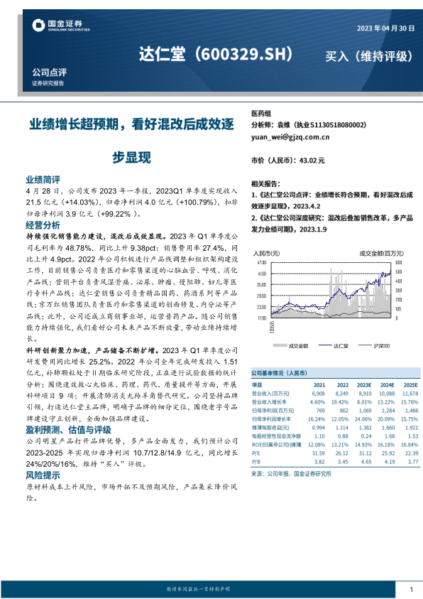 持续强化销售能力建设,混改后成效显现。2023年Q1单季度公司毛利率为48.78%,同比上升9.38pct;销售费用率27.4%,同比上升4.9pct。2022年公司积极进行产品线调整和组织架构建设工作,目前销售公司负责医疗和零售渠道的心脑血管、呼吸、消化产品线;营销平台负责风湿骨痛、泌尿、肿瘤、慢阻肺、妇儿等医疗专科产品线;达仁堂销售公司负责精品国药、药酒系列等产品线;京万红销售团队负责医疗和零售渠道的创面修复、内分泌等产品线;此外,公司还成立商销事业部,运营普药产品。随公司销售能力持续强化,我们看好公司未来产品不断放量,带动业绩持续增长。
