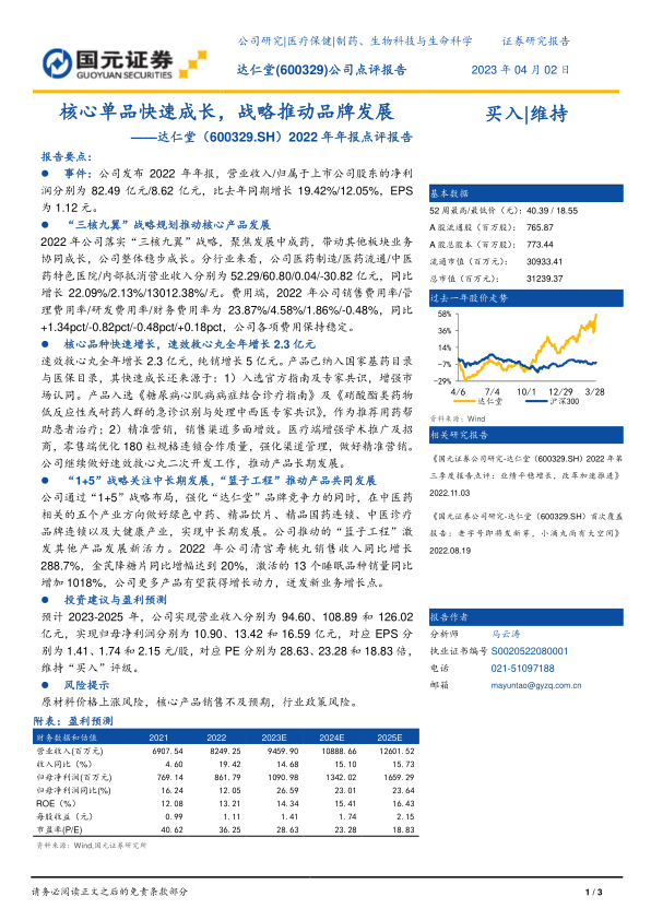 本报告对达仁堂2022年年报进行了全面分析,认为公司在“三核九翼”战略的指导下,核心业务稳健增长,并通过“1+5”战略和“篮子工程”积极拓展新的增长点。报告预测了公司未来三年的盈利情况,并维持“买入”评级,但同时也提示了相关风险。总体来看,达仁堂作为老字号药企,具备较好的发展潜力。