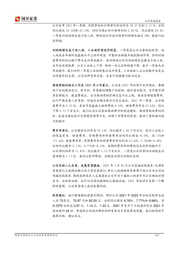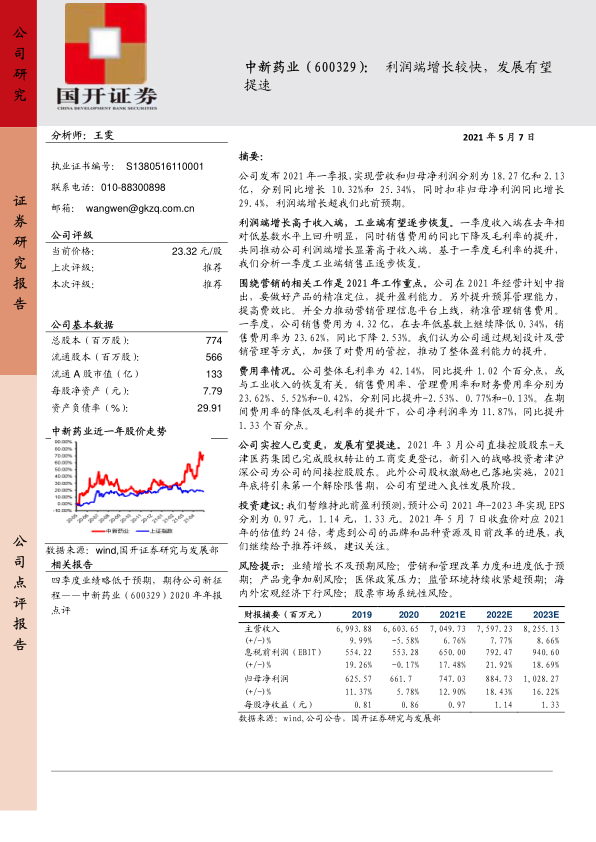 本报告对中新药业2021年一季度的业绩进行了深入分析,认为公司利润端增长超预期,工业端有望逐步恢复。同时,公司实控人变更和股权激励落地,有望为公司带来新的发展机遇。维持对中新药业的推荐评级,建议投资者关注。