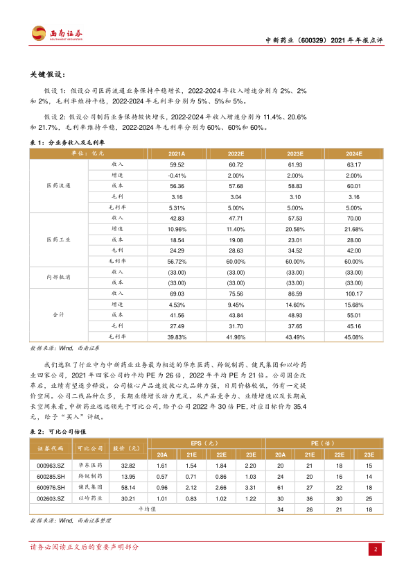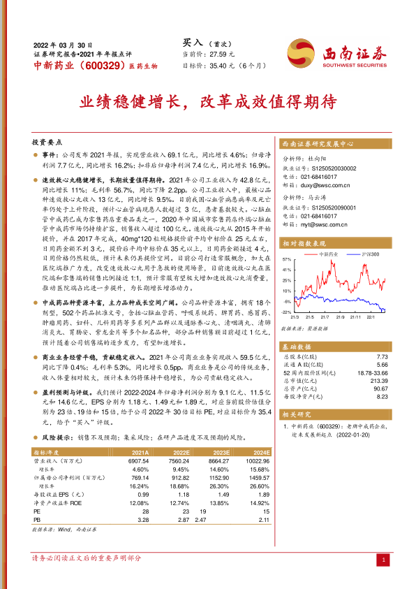 中新药业2021年年报显示公司业绩稳健增长,核心工业产品速效救心丸通过市场策略创新和应用场景拓展,展现出显著的长期增长潜力。公司丰富的中成药产品组合和稳定的商业业务为未来发展提供了坚实基础。在国企改革的背景下,公司盈利能力有望持续提升。综合考虑核心产品增长、产品线拓展及改革红利等因素,分析师给予公司“买入”评级,并设定了明确的目标价。同时,报告也专业地提示了销售、集采及研发进度等潜在风险,以供投资者全面评估。