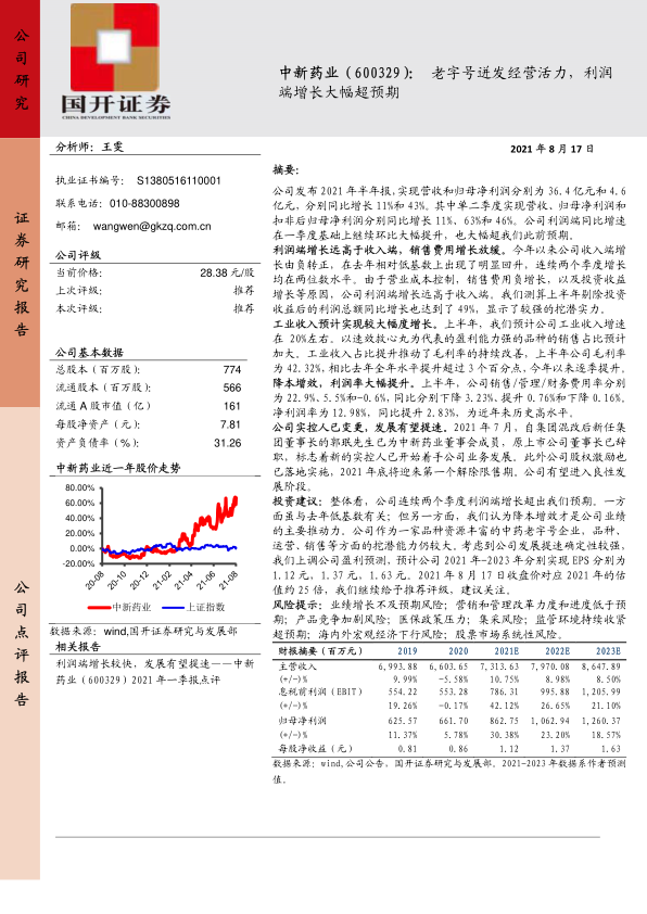 投资建议:整体看,公司连续两个季度利润端增长超出我们预期。一方面虽与去年低基数有关;但另一方面,我们认为降本增效才是公司业绩的主要推动力。公司作为一家品种资源丰富的中药老字号企业,品种、运营、销售等方面的挖潜能力仍较大。考虑到公司发展提速确定性较强,我们上调公司盈利预测,预计公司 2021 年-2023 年分别实现 EPS 分别为1.12 元,1.37 元,1.63 元。2021 年 8 月 17 日收盘价对应 2021 年的估值约 25 倍,我们继续给予推荐评级,建议关注。