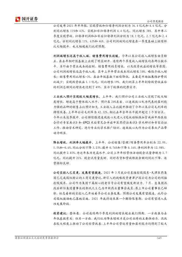 工业收入预计实现较大幅度增长。上半年,我们预计公司工业收入增速在 20%左右。以速效救心丸为代表的盈利能力强的品种的销售占比预计加大。工业收入占比提升推动了毛利率的持续改善,上半年公司毛利率为 42.32%,相比去年全年水平提升超过 3 个百分点,今年以来逐季提升。降本增效,利润率大幅提升。上半年,公司销售/管理/财务费用率分别为 22.9%、5.5%和-0.6%,同比分别下降 3.23%、提升 0.76%和下降 0.16%。净利润率为 12.98%,同比提升 2.83%,为近年来历史高水平。