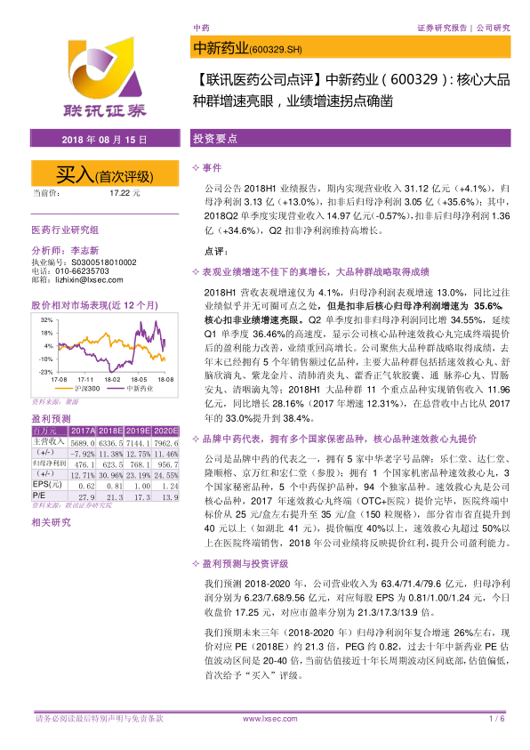 【联讯医药公司点评】中新药业:核心大品种群增速亮眼,业绩增速拐点确凿