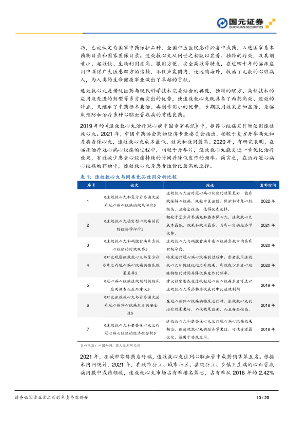 心血管疾病人口基数庞大,死亡率逐年上升,专科医院和从业人员数量逐年递增,城市医疗终端和零售药店终端中成药销售规模不断增长。公司核心产品速效救心丸剂量小、起效快、安全高效,是性价比最高的冠心病心绞痛的治疗良药之一。相较于其他同类竞品,速效救心丸目前定价偏低,日用金额在4元左右,未来仍具提价空间。销售改革后,速效救心丸销售力度有望持续加大,2021年销售额为13亿元,2022H1销售额为7.77亿元,未来仍有较大提升空间。