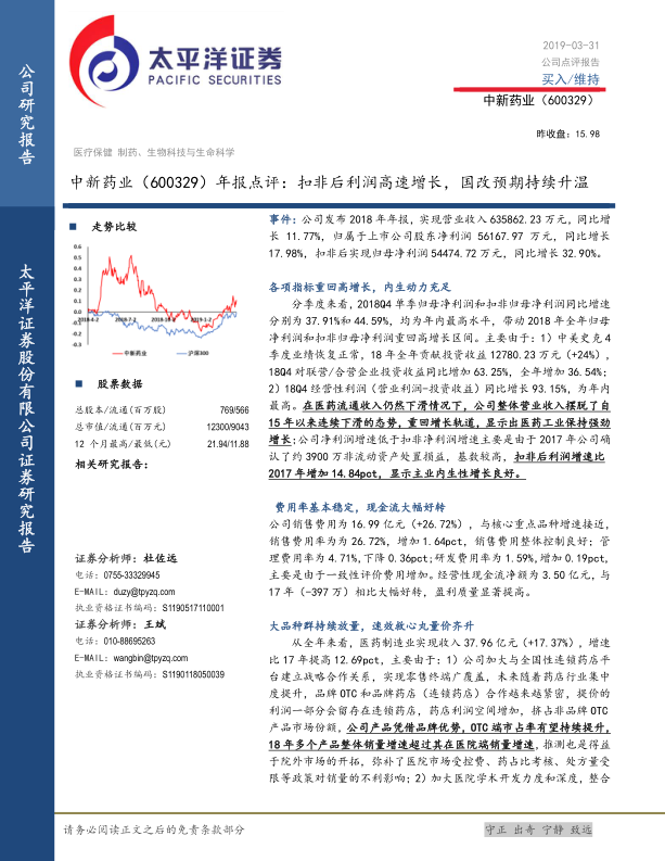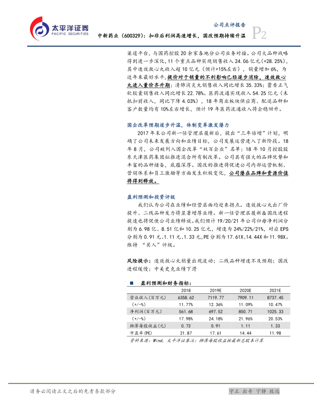 鉴于公司良好的业绩增长态势和国企改革带来的积极预期,太平洋证券维持对中新药业的“买入”评级。