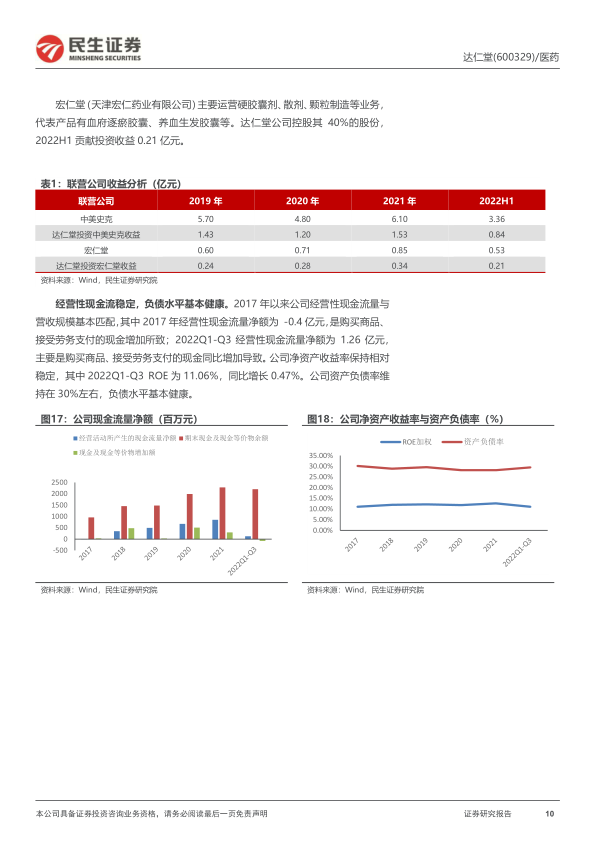 公司业绩表现稳健,营业总收入从2017年的56.89亿元增长至2021年的69.08亿元,2022年前三季度实现营收55.63亿元,同比增长3.94%。其中,中成药业务是公司的核心支柱,近五年来营收占比稳定在67%左右,毛利率维持在53%左右,远高于西药业务(营收占比约25%,毛利率约14%)。速效救心丸作为大品种,2021年实现销售收入13亿元,对营收贡献显著。公司重视品牌与渠道建设,销售费用率维持在25%左右,通过营销改革和渠道重构,推动大品种战略。归母净利润从2017年的4.76亿元增长至2021年的7.69亿元,年复合增长率达13%,2022年前三季度实现7.29亿元,盈利能力持续向好。此外,公司在联营企业如中美史克和宏仁堂的投资也贡献了可观的投资收益,2022年上半年合计占当期归母净利润的22.39%。经营性现金流稳定,资产负债率维持在30%左右,财务状况健康。