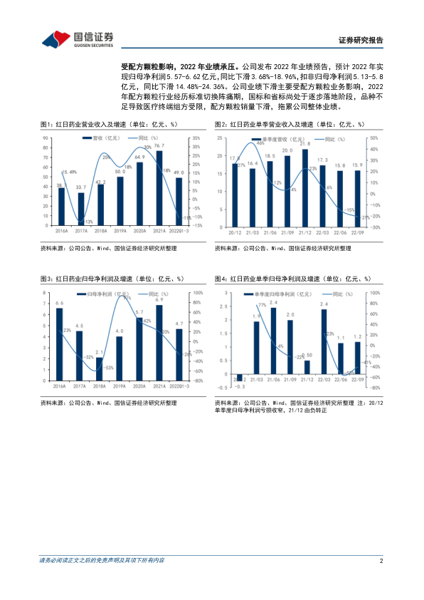2022 年全年业绩同比下滑, 单四季度表现亮眼。 公司发布 2022 年业绩预告, 预计全年实现归母净利润 5.57-6.62 亿元, 同比下滑 3.68%-18.96%,扣非归母净利润 5.13-5.8 亿元, 同比下滑 14.48%-24.36%, 单四季度归母净利润 0.87-1.92 亿元, 同比增长 72%-281%。 公司业绩下滑主要受配方颗粒业务影响, 2022 年配方颗粒行业经历标准切换阵痛期, 国标和省标品种不足导致医疗终端组方受限, 配方颗粒销量下滑, 拖累公司整体业绩, 单四季度业绩表现亮眼, 业务有序恢复。