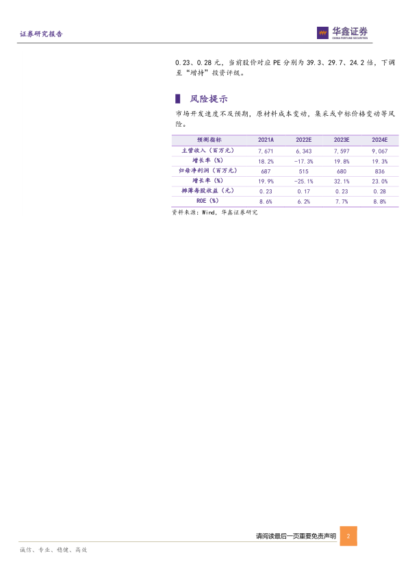 我们预测公司2022E-2024E年收入分别为63.43、75.97、90.67亿元,归母净利润分别为5.15、6.80、8.36亿元,EPS分别为0.17、0.23、0.28元,当前股价对应PE分别为39.3、29.7、24.2倍,下调至“增持”投资评级。